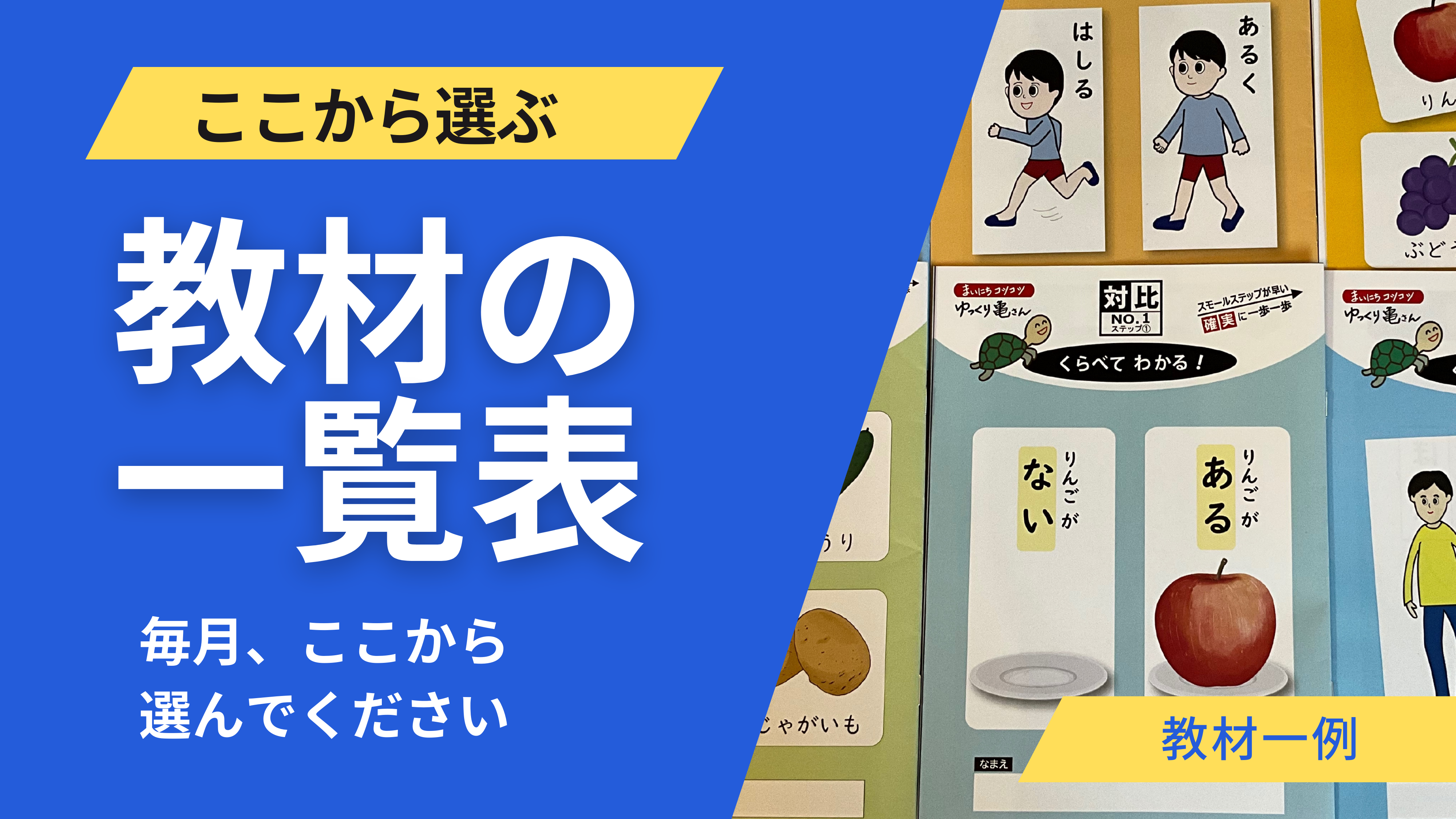 ひらがなコースでは、使用する画像はイラストを使用しています。年齢が低いときは、本物より、単純化した色や形の方が、見比べやすて、覚えやすいという研究結果があります。又、カタカナシリーズでは実物写真を利用しており、自然にマッチングできます。