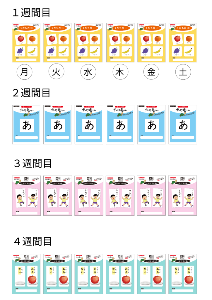 月曜日から3日間は正解を教えてきたので、お子さんも少しづつ慣れてきたと思います。確実に理解が出来ていると思われる場合は、少しづつヒントを減らして、自分で答えれるように導きましょう。
